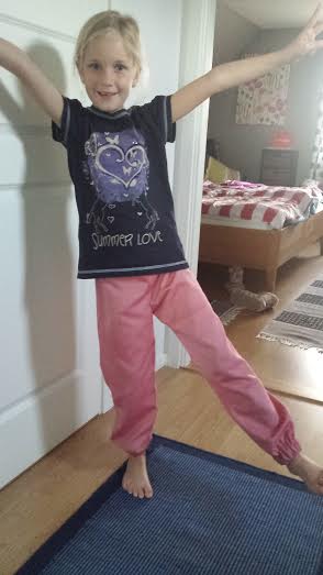 Alva var glad som en lärka och stolt som en tupp över sina nya, egensydda, rosa mjukisbyxor. Det ska hon vara. Inget är som när man bemästrat något nytt och skapat något fint på kuppen. Stora tjejen!