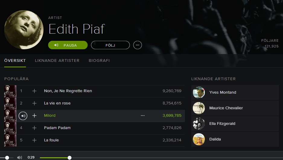 Maken går omkring och rynkar på näsan och ser mest ut som om han funderar över huruvida han behöver ringa efter någon slags hjälp. Jag har nämligen kommit in i en av mina Edith Piaf perioder. Skapar listor på Spotify och drömmer mig bort till la france.
